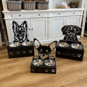 Wir fertigen Näpfe, Futterbars und Garderoben aus Stahl mit deiner Hunderasse als Motiv. Diese Produkte können personalisiert werden, wodurch jede Futterbar ein Einzelstück ist.