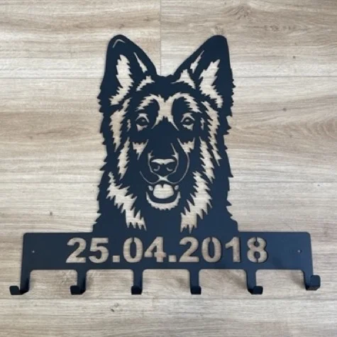 Passend zur Futterstation kannst du zusätzlich eine Garderobe mit Schäferhund Motiv bestellen. Sie bietet dir 6 oder 7 stabile Haken, um Leinen, Halsbänder, Geschirre oder Hundezubehör ordentlich zu verstauen. Mit einer Breite von ca. 49 cm und einer variierenden Höhe zwischen 37–47 cm fügt sich die Garderobe nahtlos in jedes Wohnkonzept ein.
